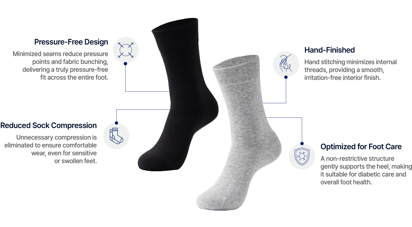 Developed with a patent-pending low-pressure band, these socks are designed to avoid tightening around the ankle. The diagonally constructed band applies only minimal pressure, helping reduce ankle compression while preventing the socks from slipping down.